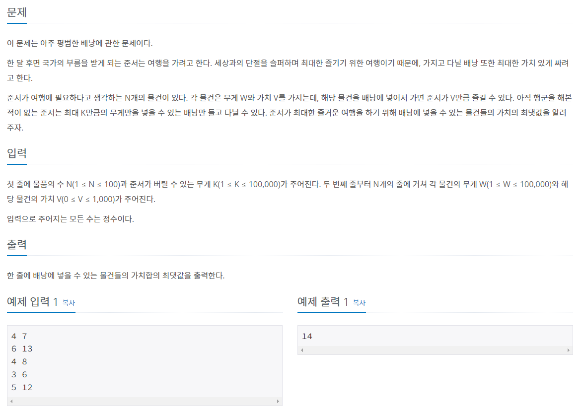 이 문제는 Knapsack Problem(냅색 문제)이다. 배낭에 담을 수 있는 무게의 최댓값이 정해져 있고, 일정 가치와 무게가 있는 짐들을 배낭