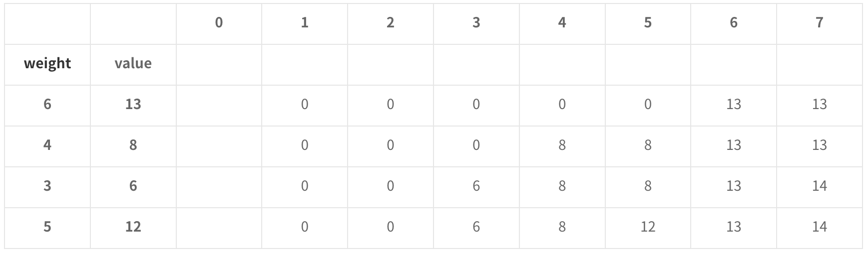 4) 3-1과 3-2 중 더 큰 값을 knapsack[i][j]에 저장해준다. 이 값은 현재까지의 물건들로 구성할 수 있는 가장 가치 높은 구성이다.