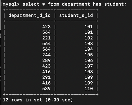 Department_has_student는 department와 student의 다대다 연결을 위한 연결테이블로 PK인 department_d_id, student_s_id만 갖는다.