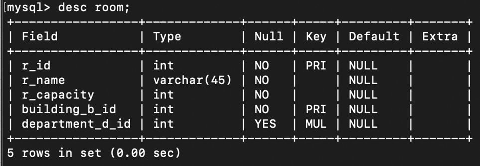 Room에서는 r_id가 Primary Key이고 type은 관리하기 쉽도록 integer로 설정하였다. r_name은 varchar로 이름에 가변성을 주었다. 이때 room의 이름은 다른 건물에서는 겹치는 이름이 있을 수 있어서 unique key로는 설정하지 않았다. r_capacity는 수용량이므로 integer로 설정하였고 같은 사이즈의 방은 많이 있을 수 있으므로 unique key로 설정하지 않았다. 그러나 모두 정보가 없다면 불편함이 많을 것으로 추정되어 notnull설정을 해주었다. 다음으로 building_b_id는 각각 room이 building에 반드시 포함되어야하므로 연결해주는 FK역할을 해야하므로 PK로 설정을 해주었다. 반면 department_d_id는 room이 department에 반드시 포함되어야 하는 것은 아니므로 비식별에 null possible로 설정해주었다.