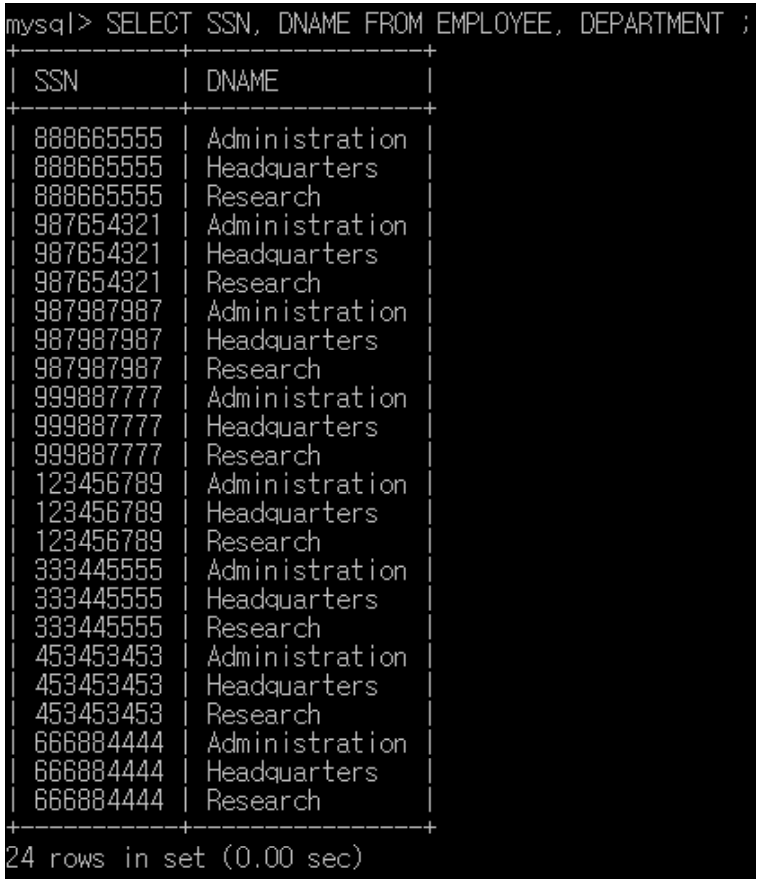 FROM EMPLOYEE, DEPARTMENT;