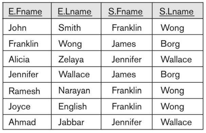 위 예는 EMPLOYEE에 대해서 두 개의 별명(alias) E와 S를 선언하여 사용한다.
