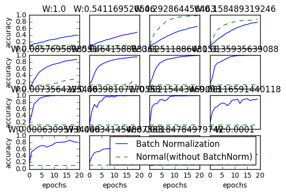 배치 정규화 효과를 보기 위해 MNIST 데이터 셋을 사용하여 배치 정규화 계층을 사용할 때와 사용하지 않을 때 학습 진도를 비교해보자. 가중치 초기값의 표준편차를 다양하게 바꿔가며 학습 경과를 살펴보았다.