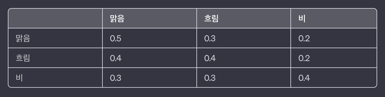 날씨 예측을 예를 들면 아래와 같이 각 상태에 따른 다음 상태의 확률을 지정하여 3X3 행렬을 만들 수 있다.