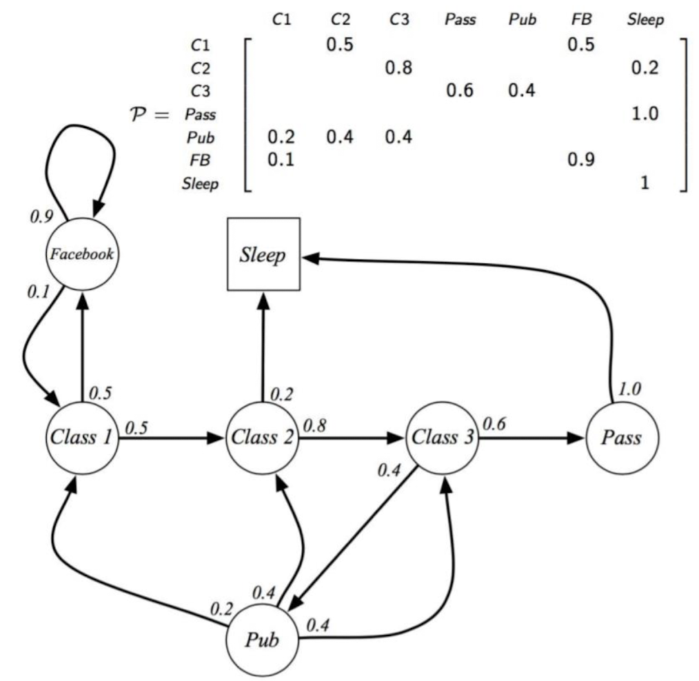 위의 Student Markov Process로 Sleep은 도착하면 더이상 다른 곳으로 가지 않는 시퀀스의 종료를 나타내는 terminal인데 이는 Markov Process에서 반드시 존재하지는 않는다.