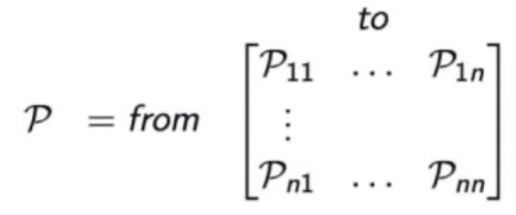 상태 전이 행렬(State Transition Matrix)은 마르코프 체인이나 마르코프 결정 과정과 같은 확률 과정에서 상태 간의 전이 확률을 나타내는 행렬이다. 이 행렬은 각 상태에서 다른 상태로의 전이 확률을 체계적으로 표현하는데 사용된다. 이는 아래와 같이 수식으료 표현할 수 있고 이때 P는 행렬로 표현된다.