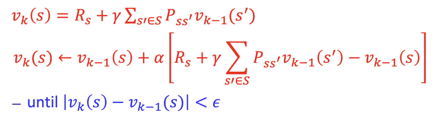 k번째에서는 v_k(s')가 필요한데 위와 같이 iterative 기법을 이용하려면 다음 step의 state value를 알 수 없으니 v_k-1(s')로 대체하여 사용하는 것을 볼 수 있다. 그러나 k번째와 k-1번째 state value의 차이가 매우 줄어들때까지 반복하면 그 결과가 유의미하게 잘 나오기에 이러한 방식으로 대체하여 이용한다.