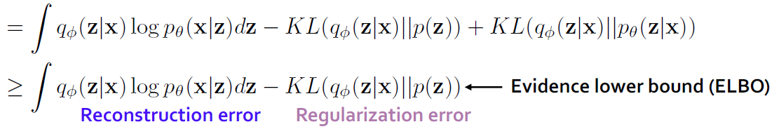 이 마지막 부등식의 우항을 evidence lower bound, 줄여서 ELBO라고 부른다. 이 ELBO를 maximize함으로써 likelihood 또한 maximze할 수 있는 것이다.