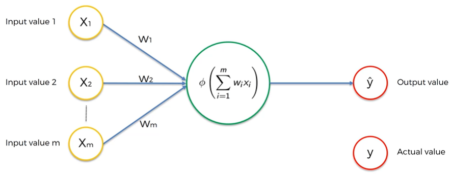각 Input에 가중치를 의미하는 weights를 적용해주고 함수에 값을 전달하는 시냅스가 있다. 가중치를 결정하는 과정에서 다른 수업에서 들었던 Gradient descent와 같은 내용이 적용된다. 각 신호들을 더하고 activation fuction을 통해 output에 전달 한다.